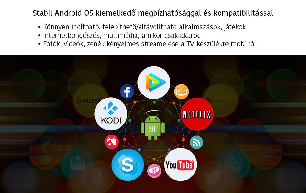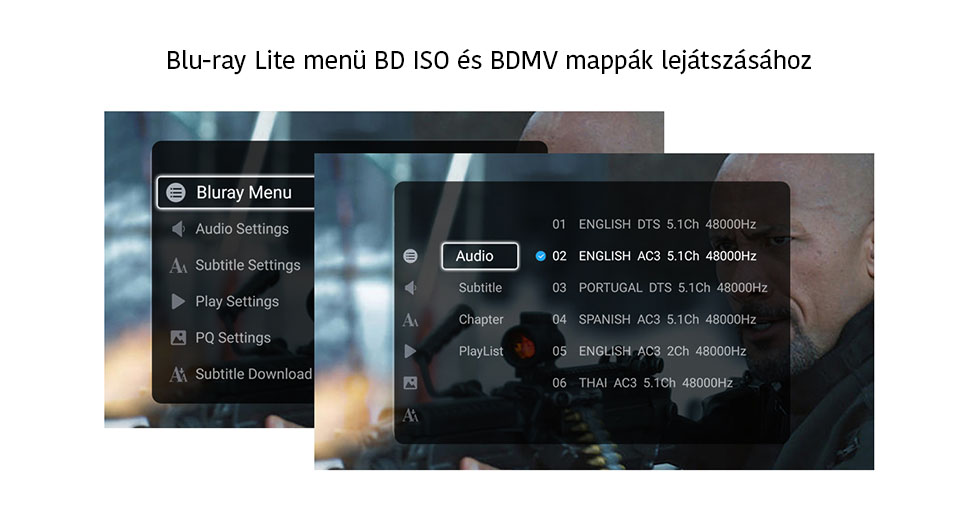 - Támogatott videókodek: H.256/HEVC, H.264, VC1, MPEG4, MPEG2, VP9, VP8, VP6, AVS (250 Mbps-ig), 2D/3D BD ISO, BDMV mappa – alkalmazástól függ.